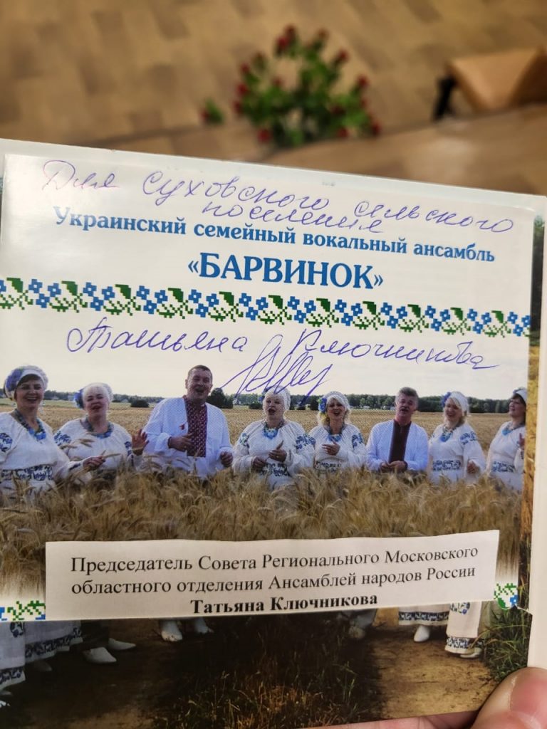 В результате присоединения к совету, мы получили в подарок от председателя регионального Московского областного отделения ансамблей народов России Татьяны Ключниковой ее авторский альбом песен. Этот подарок был вручен нашему известному хору «Ладога-Молина».